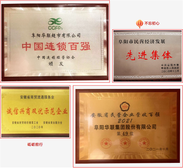 憑借穩健的綜合運營(yíng)能力,及持續不斷的創(chuàng )新,阜陽(yáng)華聯(lián)多年以來(lái)攬獲“中國連鎖業(yè)百強第72位”、“民營(yíng)經(jīng)濟先進(jìn)集體”、“誠信興商雙優(yōu)示范企業(yè)”、“阜陽(yáng)市優(yōu)秀民營(yíng)企業(yè)”、“安徽省民營(yíng)企業(yè)營(yíng)收百強”“阜陽(yáng)市十佳商貿企業(yè)”等多項榮譽(yù)等多項榮譽(yù),品牌影響力再躍新臺階!