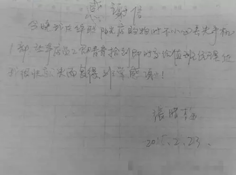 顧客拿回失而復得的手機很高興,想親自對她說(shuō)聲謝謝。卻聽(tīng)說(shuō)她已經(jīng)上貨去了,這種把拾金不昧當成一件隨手小事的精神讓顧客更加敬佩感動(dòng)!便親手寫(xiě)下這封感謝信并發(fā)給華聯(lián)微信公眾號。 這就是這封感謝信的由來(lái)! 邵青青拾金不昧的行為給我們帶來(lái)了滿(mǎn)滿(mǎn)的正能量!