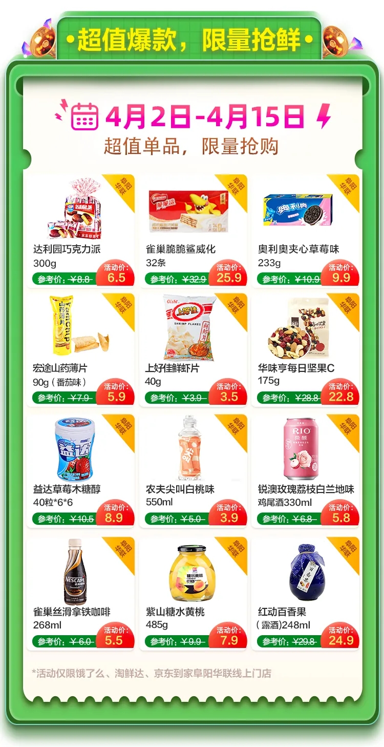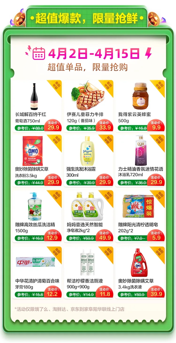還好你有阜陽(yáng)華聯(lián),淘寶淘鮮達、餓了么、京東到家都能下單。線(xiàn)下親眼所見(jiàn)的品質(zhì),