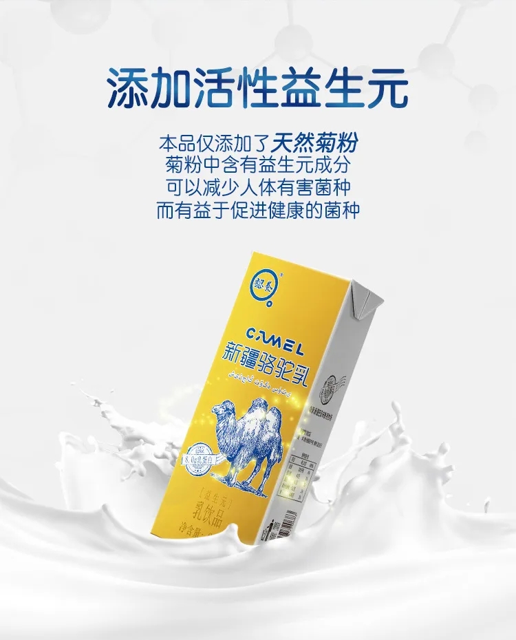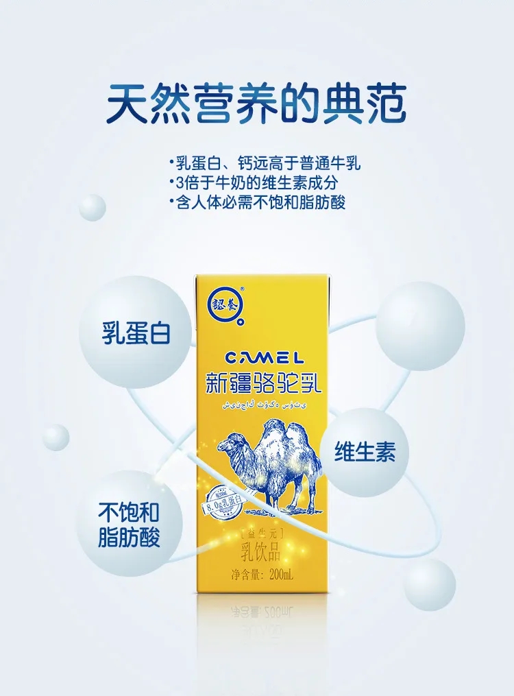 認養新疆駱駝乳,每盒200毫升,在原駝乳的基礎上,添加了天然益生元成分,