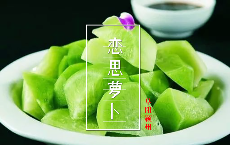 戀思蘿卜又名“鴨蛋酥”。卵圓形,外皮翠綠、質(zhì)脆味甜、食之如梨、無(wú)絲無(wú)渣、營(yíng)養豐富,放水中能自動(dòng)炸皮、落地則可摔成數瓣。戀思蘿卜產(chǎn)于阜陽(yáng)市西湖鎮(舊稱(chēng)大田集),位于阜陽(yáng)西三十華里之處。