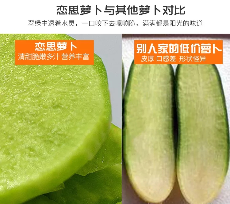 種植戶(hù)告訴我們:戀思蘿卜在地下面的只占蘿卜的五分之一,一般的蘿卜五分之一長(cháng)在土外面,可戀思蘿卜幾乎五分之四全長(cháng)在土外面,這種蘿卜屬于水果蘿卜。