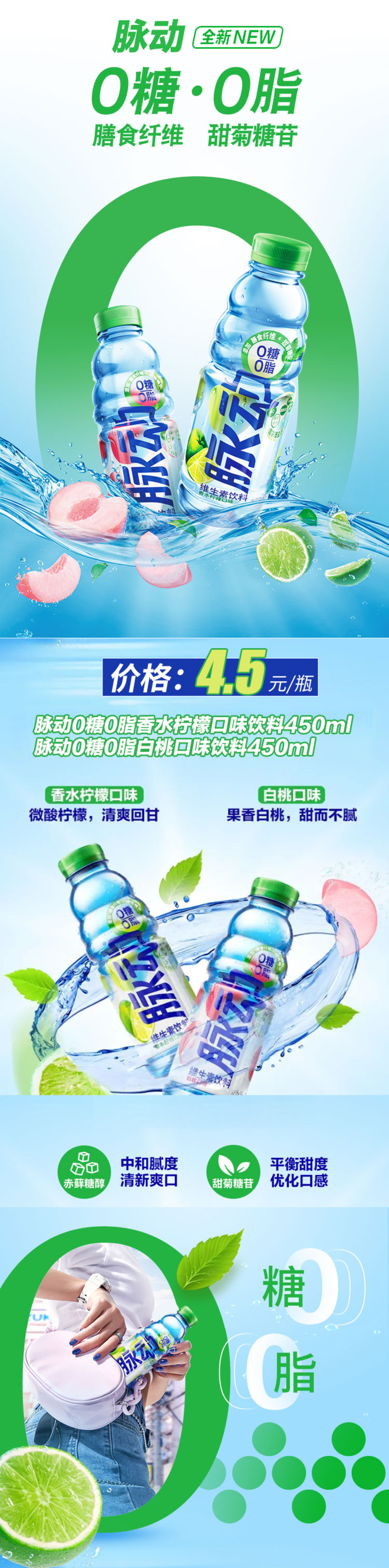 由脈動(dòng)推出的全新0糖0脂維生素飲料,為了滿(mǎn)足消費者對無(wú)糖的追求,脈動(dòng)0糖維生素飲料采用赤蘚糖醇和甜菊糖苷來(lái)代替蔗糖,可以輕松享受無(wú)負擔。更為重要的是,即使“清零”了糖份和脂肪,脈動(dòng)0糖里的維生素和膳食纖維仍然能夠繼續補充每日所需的營(yíng)養。